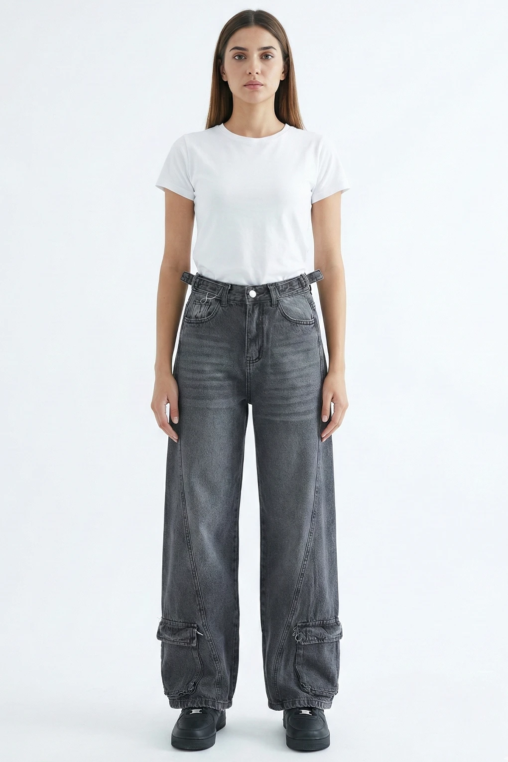 Maxi wide cargo lavado gris localizado y bigotes con cintura regulable